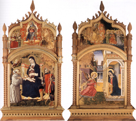 Мадонна с младенцем на троне между святым Франциском Ассизским и святым Себастьяном, Благовещение, Предвечный Отец и ангелы.1482 г.