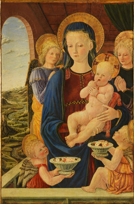 Мадонна с младенцем, двумя поклоняющимися ангелами и двумя подносящими вазами с цветами. Около 1460 г.