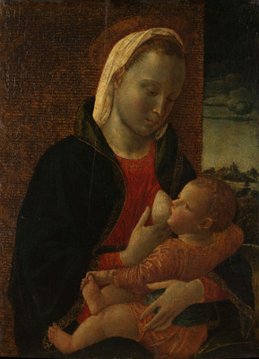 Мадонна с младенцем, гранатом и пятью ангелами.( Мадонна делла Зьепе).1450-1455 гг.