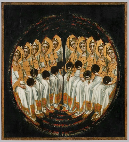 Группа из десяти сидящих ангелов, увенчанных шаром и украшенным лилиями флабеллумом (Серафимы [?]).Середина XIV в.