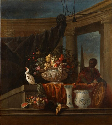 Натюрморт с фруктами, арапчонком и попугаем на фоне классической архитектуры.Вторая половина XVII в.