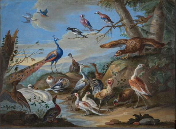 Холмистый пейзаж с павлином, орлом и другими птицами.1660 – 1669 гг.