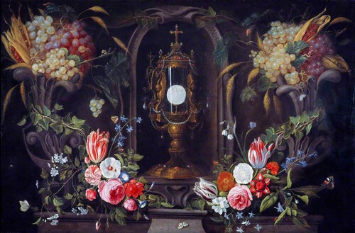 Натюрморт с цветами и виноградом, окружающими дароносицу.Около 1670 г.