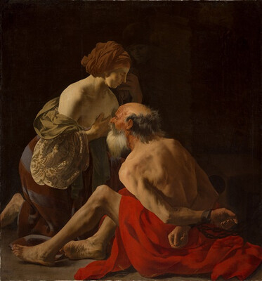 Происхождение:«Анна Хоффейзерс, Дордрехт (до дня смерти; опись ее поместья, 18 июля 1674 г., как «Een Stick van Terbrugge daer een out man van sijn dochter gevoet»); Авраам Перонно, Амстердам (1687 – ум. 1691; продажа, Амстердам, 13 мая 1687 г., как «... een Vrou die inde gevanckenisse haer Vader, de borst te suygen geeft», выкуплен; продажа его поместья, Амстердам, 6 января 1692 г., как «Daer de dochter de Vader de borst geeft, van Манфредо», для эт. 250); частная коллекция, Флоренция; частная коллекция, Милан, по происхождению (конец XIX века – 2019 г.); Trinity Fine Art, Лондон (2019–20);приобретена музеем в 2020 г.