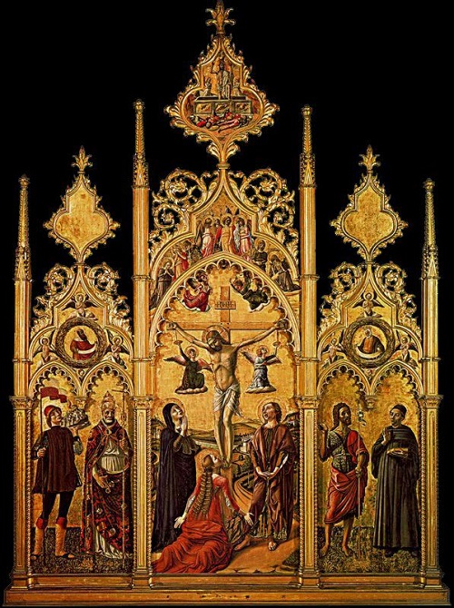 Триптих: Распятие со святыми Венанцием, Петром, Иоанном Крестителем и Порфирием, известный как «Камеринский триптих».Около 1480 г.