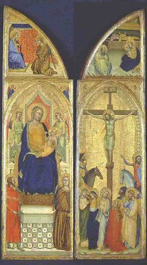 Богоматерь на троне с младенцем Христом (правая створка триптиха) с Благовещением выше; Христос на кресте (левая створка триптиха) с Рождеством выше.1355 г.