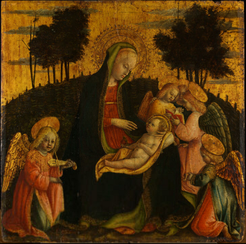 Мадонна с младенцем, гранатом и пятью ангелами.( Мадонна делла Зьепе).1450-1455 гг.
