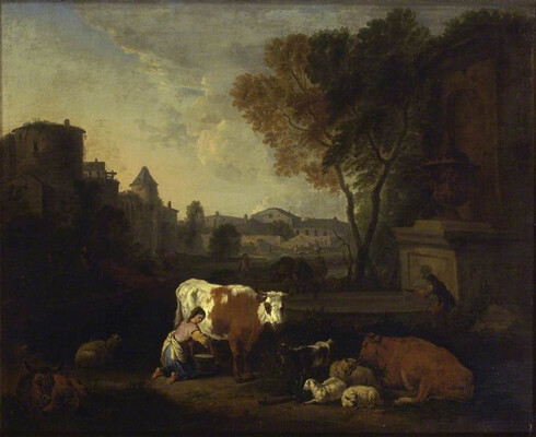 Итальянский пейзаж с девушкой, доящей корову.Около 1670 г.