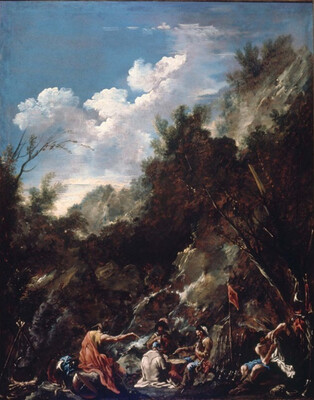 Солдаты играют в карты на фоне скалистого пейзажа.
