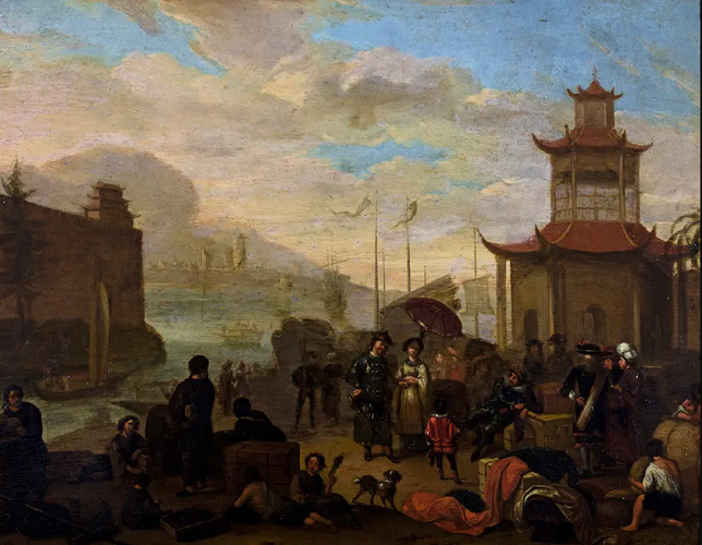 Голландские торговцы ведут торговлю в китайском порту.1670 - 1702 гг.