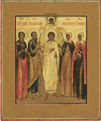 Избранные святые: Ангел-Хранитель, апостол Иаков Алфеев, равноапостольная Мария Магдалина, мученицы Наталия Никомидийская и Стефанида Дамасская. Вторая четверть XIX в.